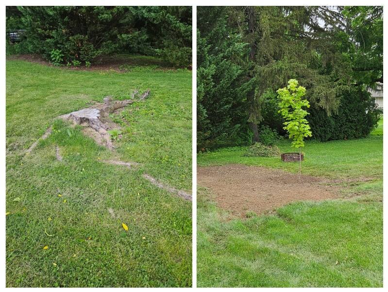 We offer stump grinding alongside our tree removal services, leaving no trace the tree was there. We will also come in just for stumps. We grind 4-6 inches below ground level and fill with topsoil, packing it and grading it smooth for your convenience.